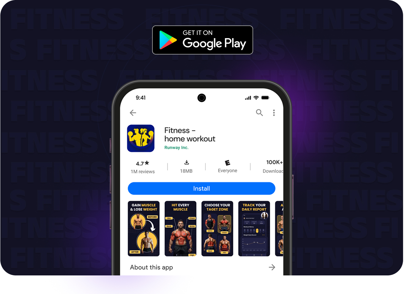 Objective: Design high-quality, engaging screenshots for Google Play to promote a home workout app that helps users stay fit without gym equipment.